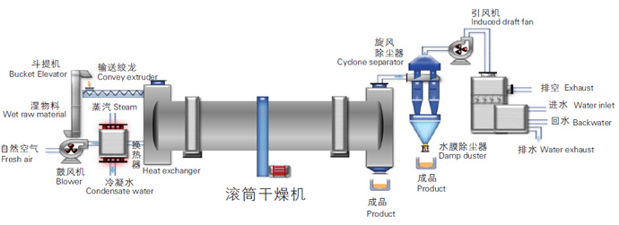 湿物料从干燥机一端投入后,在内筒均匀的超版器翻动下,物料在干燥器内均匀分布与分散,且与并流的热空气充分接触,加快了干燥传流、传质推动力。在干燥过程中,物料在带有倾斜度的抄板和热气流作用下,可调控地运动至干燥机另一段星形卸料阀排出成品。